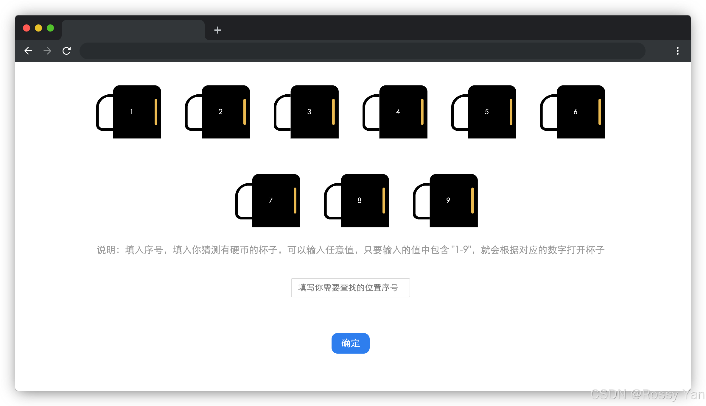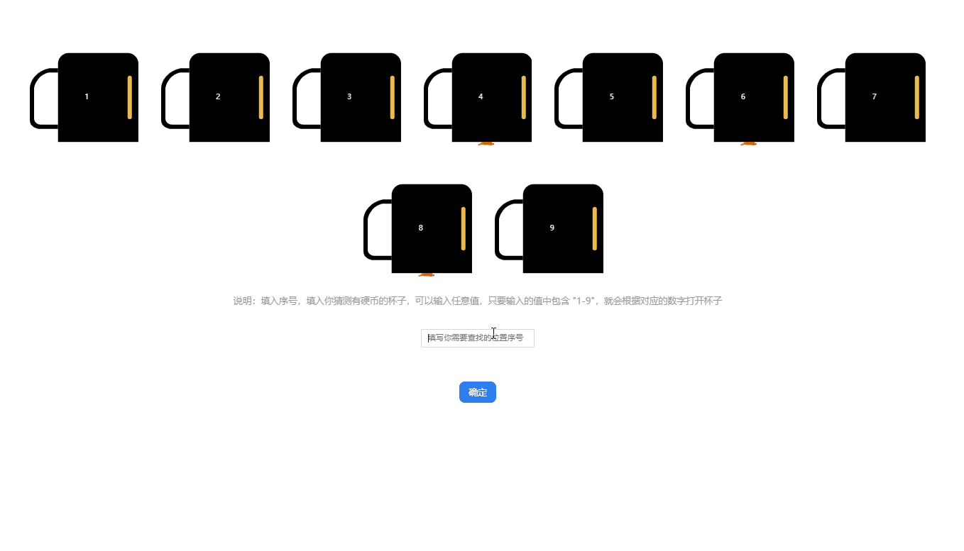 说明:填入序号,填入你猜测有硬币的杯子,可以输入任意值,只要输入的值中包含