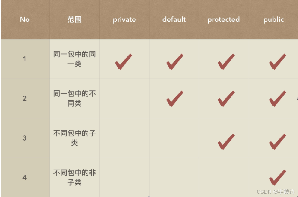 【说明】protected 主要是给继承使用;default 只能给同一个包内使用;按照自己的理解去记忆。