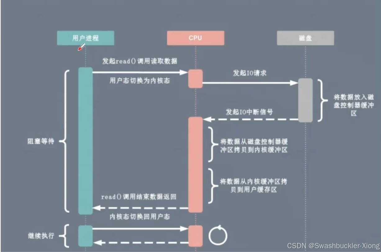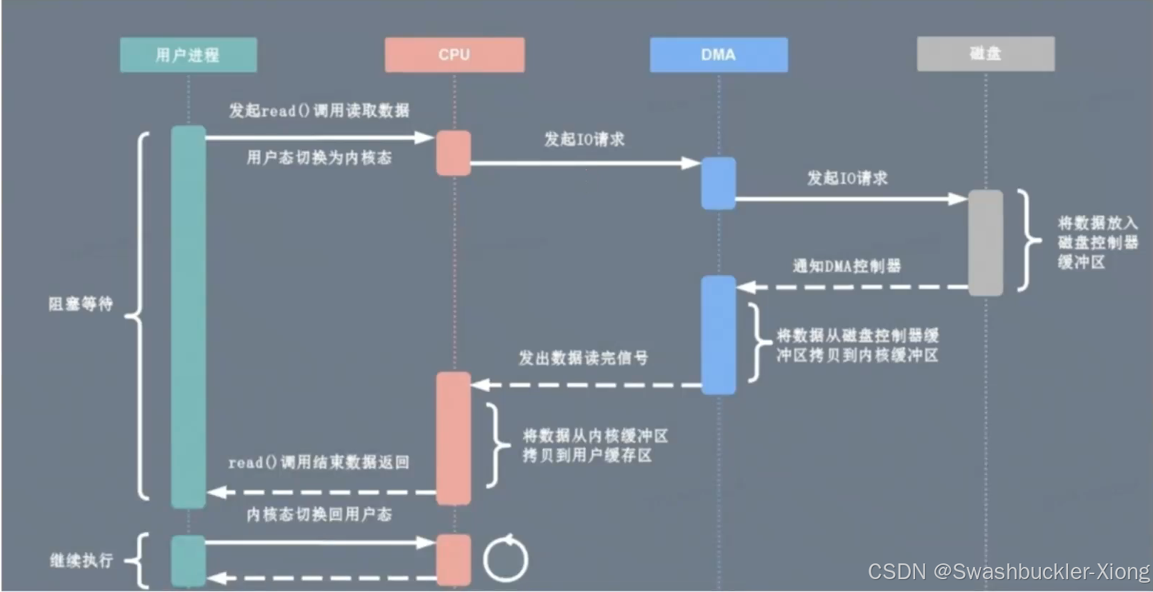 1、用户进程向CPU发起read系统调用读取数据,由于用户态切换为内核态,read一直阻塞等待数据的返回。 2、CPU在接收到指令以后对DMA磁盘控制器发起调度指令。 3、DMA磁盘控制器对磁盘发起IO请求,将磁盘数据先放入磁盘控制器缓冲区,CPU全程不参与此过程。 4、数据读取完毕后,DMA磁盘控制器会接收到磁盘的通知,将数据从磁盘控制器缓冲区拷贝到内核缓冲区。 5、DMA磁盘控制器向CPU发出数据读完的信号,由CPU负责将数据从内核缓冲区拷贝到用户缓冲区。 6、用户进程由内核态切换回用户态,解除阻塞状态,然后等待CPU的下一个执行时间片。