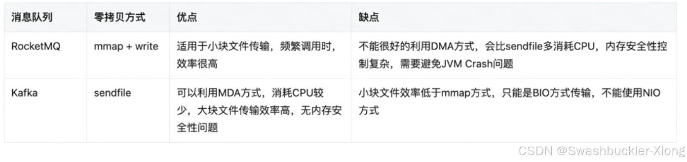 RocketMQ选择了mmap + write 这种零拷贝方式,适用于业务级消息这种小块文件的数据持久化和传输。而KafKa采用的是sendfile这种零拷贝方式,适用于系统日志消息这种高吞吐量的大块文件的数据持久化和传输。但是值得注意的一点是,KafKa的索引文件使用的是mmap + write 方式,数据文件使用的是sendfile方式。