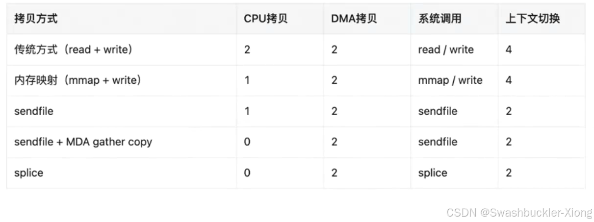 无论是传统IO拷贝方式还是引入零拷贝方式,2次DMA copy是少不了的,因为两次DMA都是依赖硬件完成的。下面从CPU拷贝次数、DMA拷贝次数以及系统调用几个方面总结一下上述几种IO拷贝的差别: