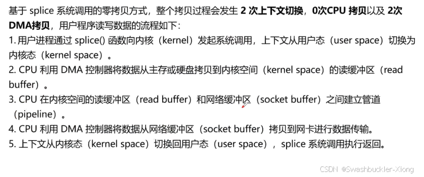 splice(fd_in, off_in, fd_out, off_out, len, flags);splice系统调用可以在内核空间的读缓冲区和网络缓冲区间建立管道,从而避免了两者之间的 CPU 拷贝操作。