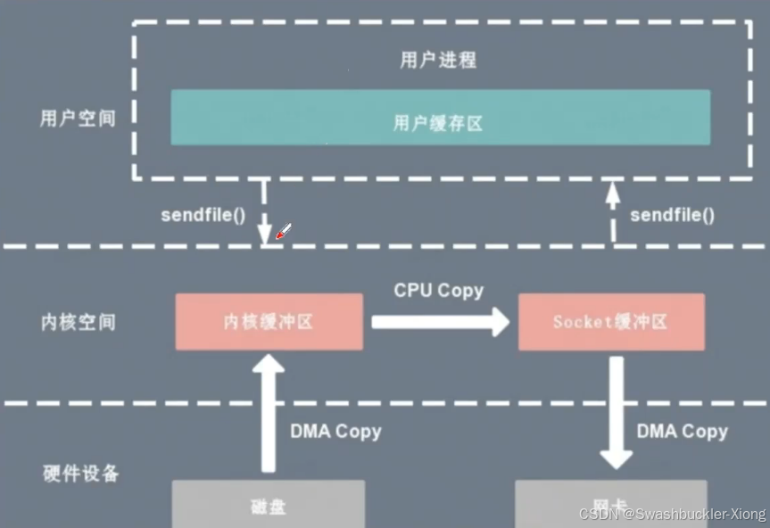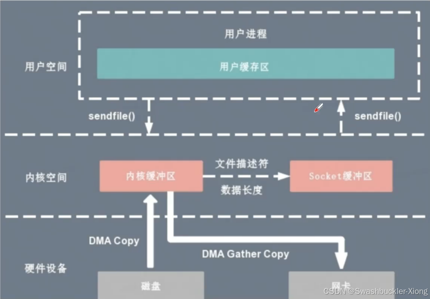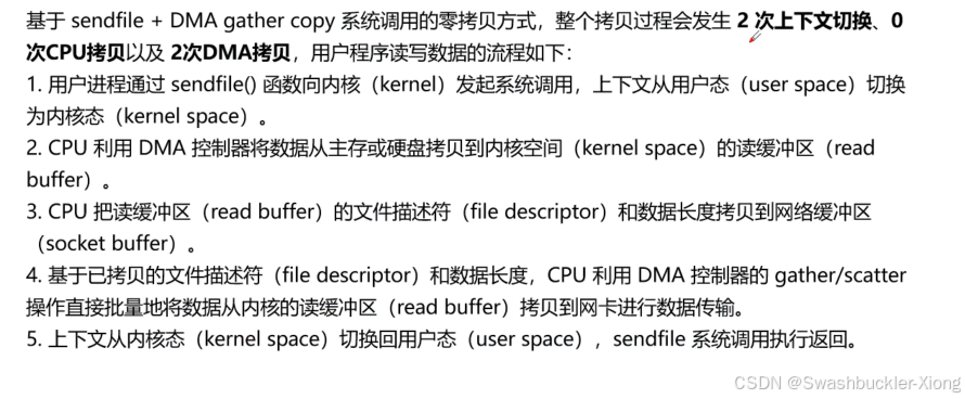 Linux2.4版本的内核对sendfile系统调用进行修改,为DMA拷贝引入了 gather 操作。它将内核空间读缓冲区对应的数据描述信息(内存地址、地址偏移量)记录到相应的网络缓冲区中,由DMA根据内存地址、地址偏移量将数据批量地从读缓冲区拷贝到网卡中,这样就省去了内核空间中仅剩的1次CPU拷贝操作。