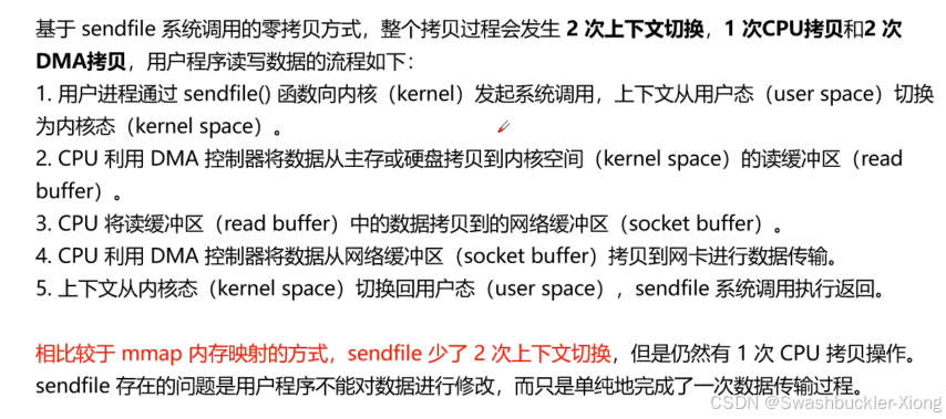 sendfile + DMA gather copy 拷贝方式同样存在用户程序不能对数据进行修改的问题,而且本身需要硬件的支持,它只适用于将数据从文件拷贝到socket套接字上的传输过程。