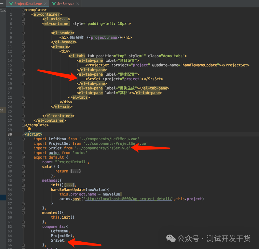 3. 回到SrsSet.vue中,接收这个项目信息。这个项目信息中的id我们之后要用来发送一个接口给后台,用来传送原始需求和展示分解优化后的需求。