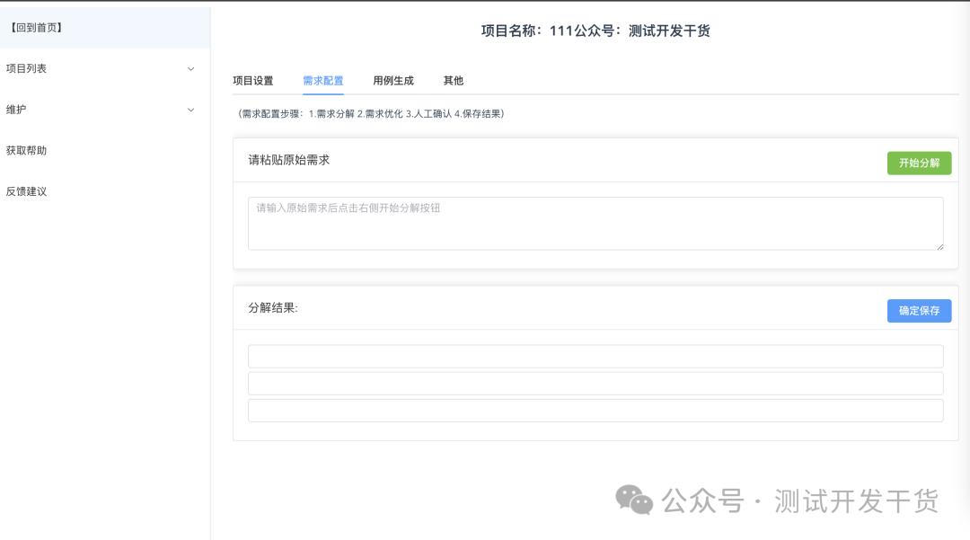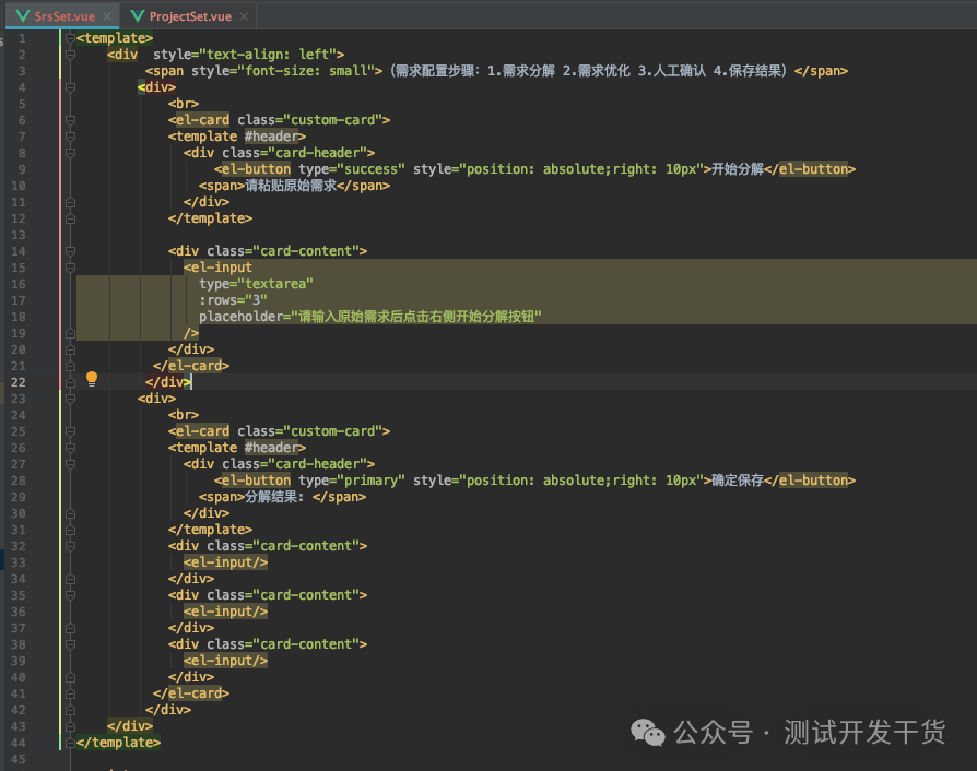 <template> <div style="text-align: left"> <span style="font-size: small">(需求配置步骤:1.需求分解 2.需求优化 3.人工确认 4.保存结果)</span> <div> <br> <el-card class="custom-card"> <template #header> <div class="card-header"> <el-button type="success" style="position: absolute;right: 10px">开始分解</el-button> <span>请粘贴原始需求</span> </div> </template> <div class="card-content"> <el-input type="textarea" :rows="3" placeholder="请输入原始需求后点击右侧开始分解按钮" /> </div> </el-card> </div> <div> <br> <el-card class="custom-card"> <template #header> <div class="card-header"> <el-button type="primary" style="position: absolute;right: 10px">确定保存</el-button> <span>分解结果: </span> </div> </template> <div class="card-content"> <el-input/> </div> <div class="card-content"> <el-input/> </div> <div class="card-content"> <el-input/> </div> </el-card> </div> </div></template><script> export default { name: "SrsSet", props:["project"], computed: { name: { get() { return this.project.id; // 从prop获取初始值 }, } } }</script><style scoped>.card-content{ margin-bottom: 5px;}</style>
