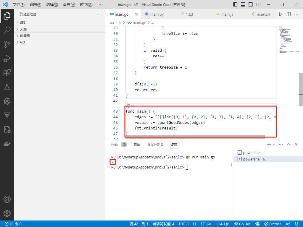 9.在 main 函数中构造示例输入 edges 作为树的边的关系,调用 countGoodNodes 函数计算“好节点”数量,并打印结果。