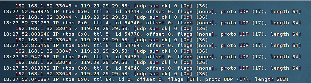 最后发现没有回显途径的路径信息,这个不回显不一定是有影响,抓包看是没有中间节点响应,怀疑是运营商限制以UDP协议访问。