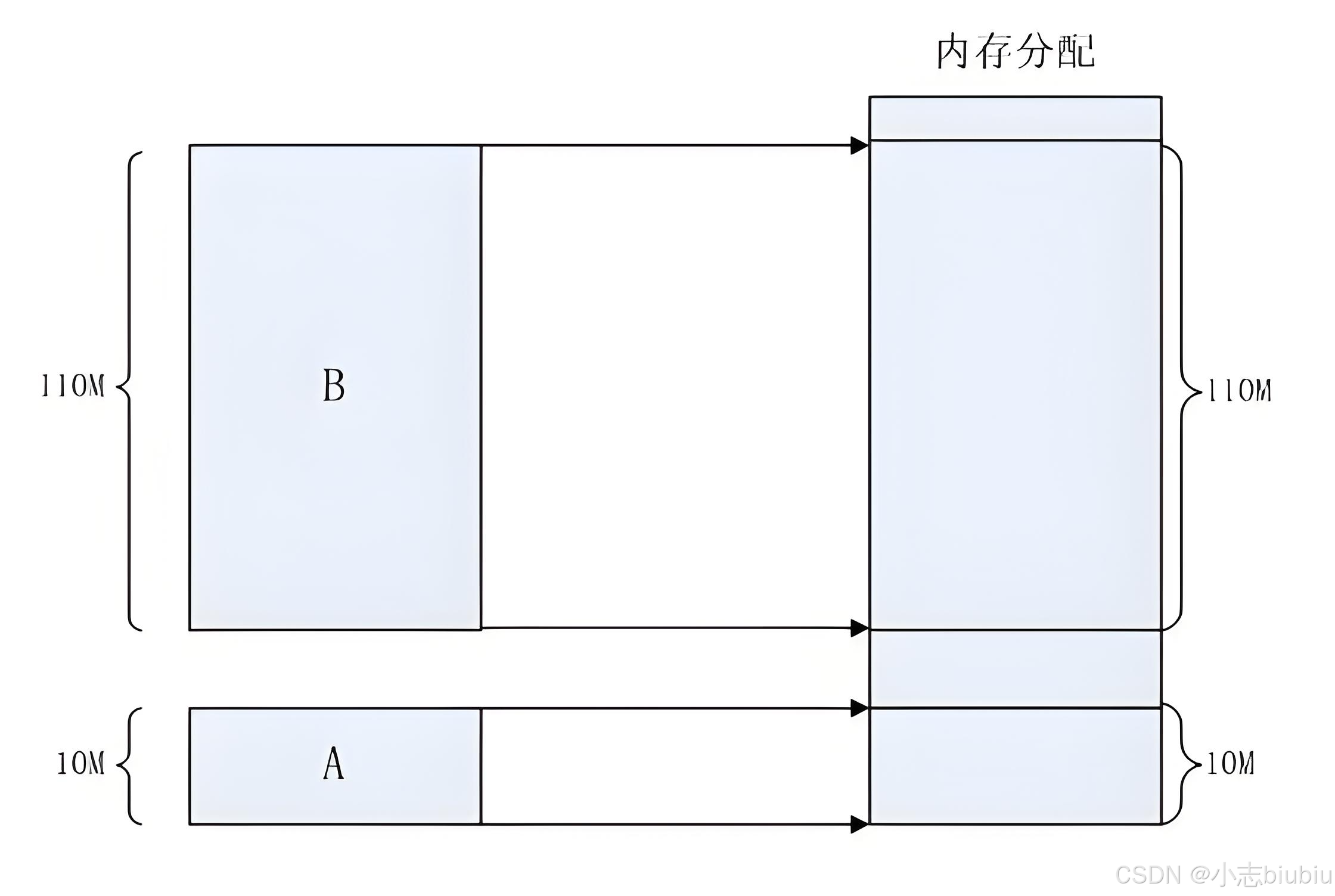 那当程序同时运行多个程序时,操作系统是如何为这些程序分配内存的呢?例如某台计算机总的内存大小是128M,现在同时运行两个程序A和B,A需占用内存10M,B需占用内存110。计算机在给程序分配内存时会采取这样的方法:先将内存中的前10M分配给程序A,接着再从内存中剩余的118M中划分出110M分配给程序B。