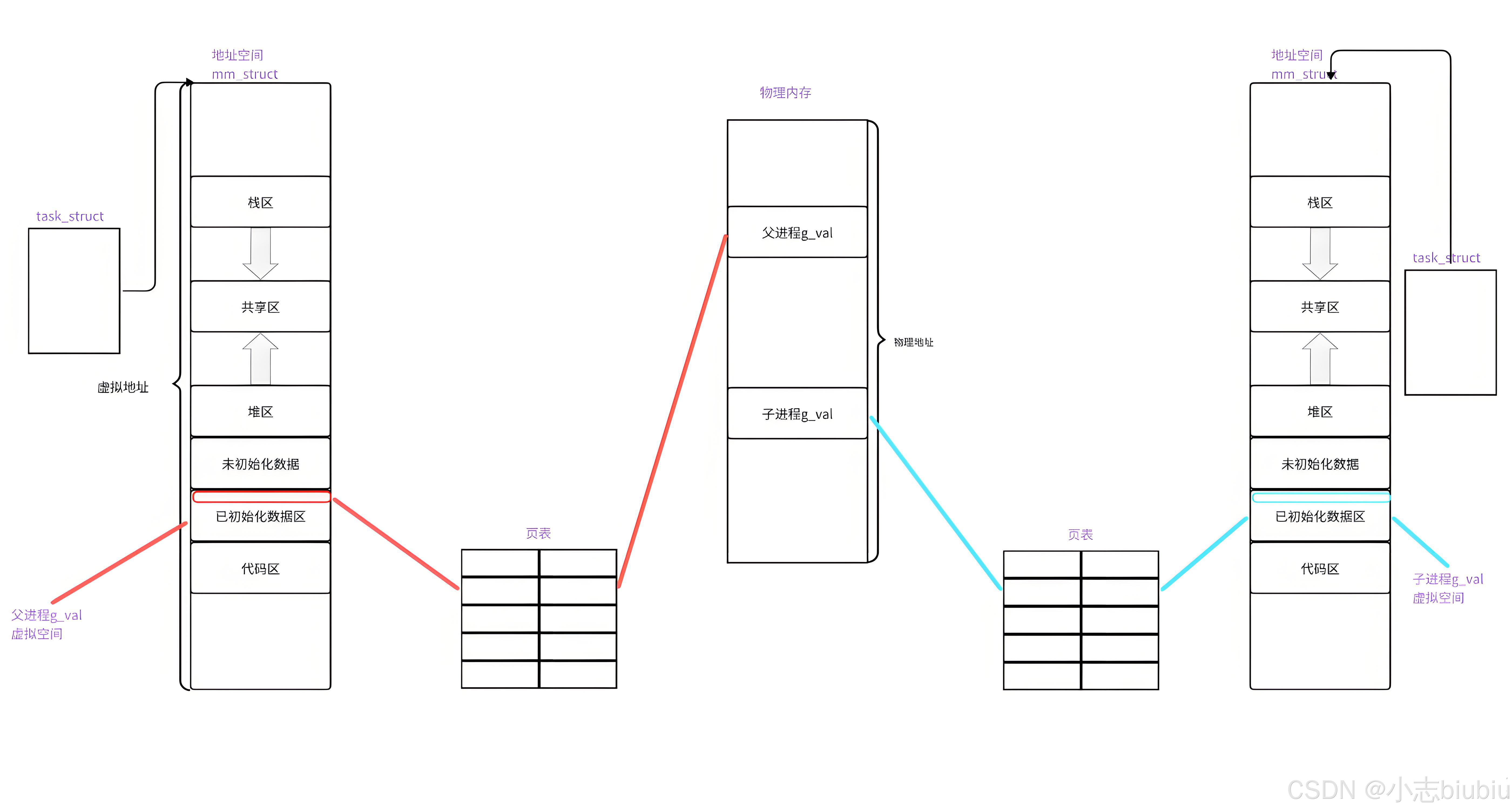我们发现,父子进程,输出地址是一致的,但是变量内容不一样!能得出如下结论:
