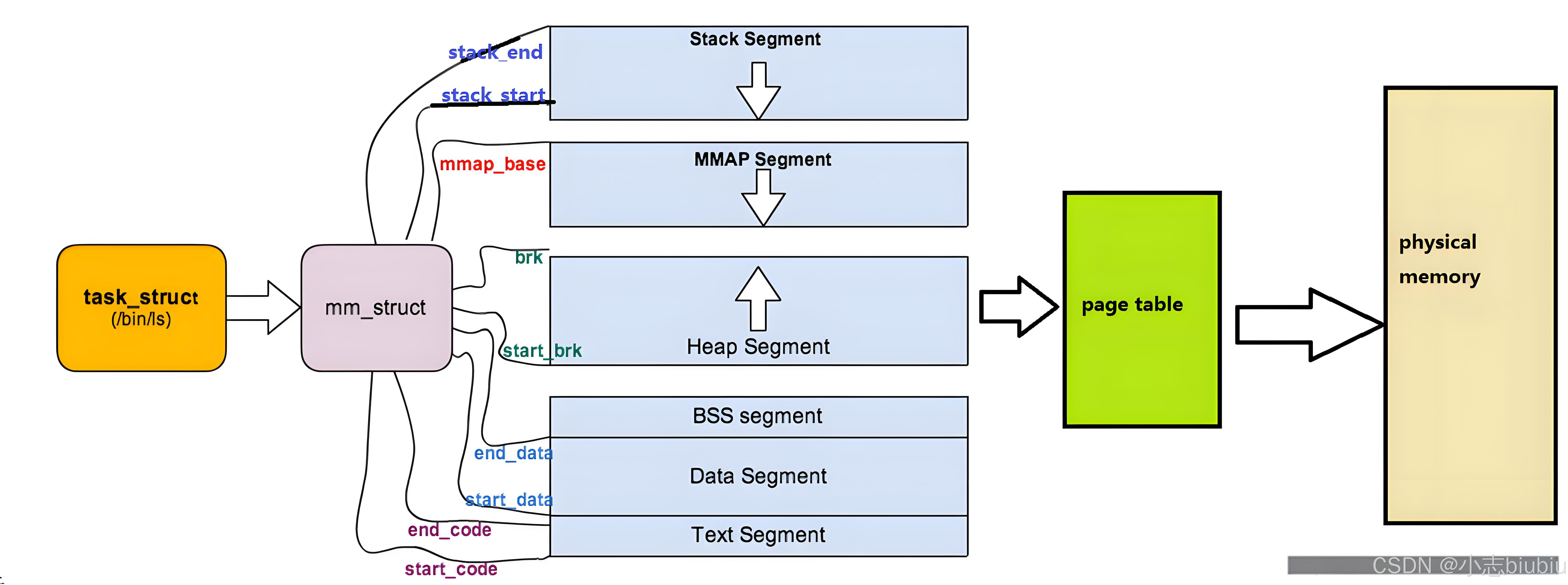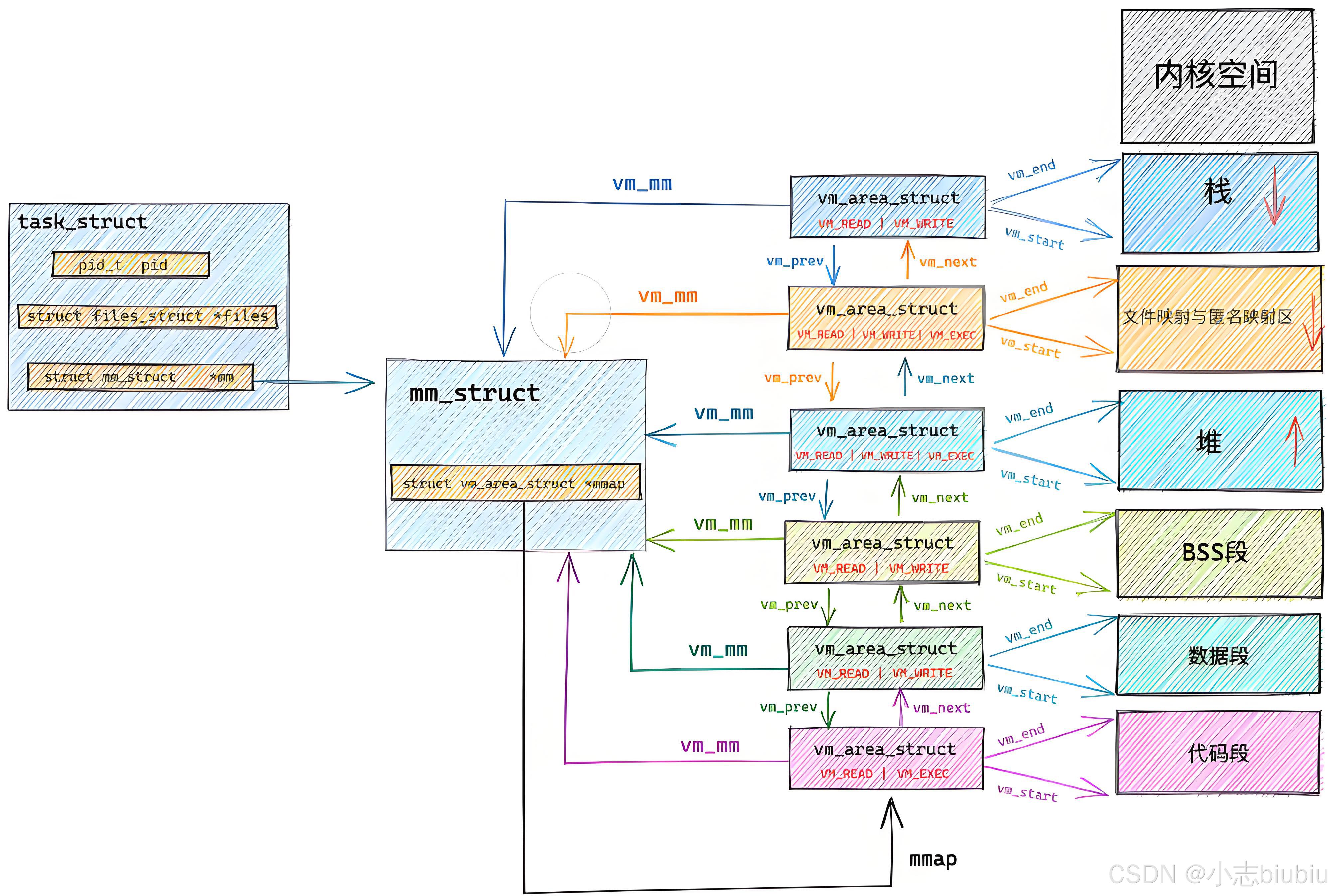 可以说,mm_struct结构是对整个用户空间的描述。每一个进程都会有自己独立的mm_struct,这样每一个进程都会有自己独立的地址空间才能互不干扰。先来看看由task_struct到mm_struct,进程的地址空间的分布情况: