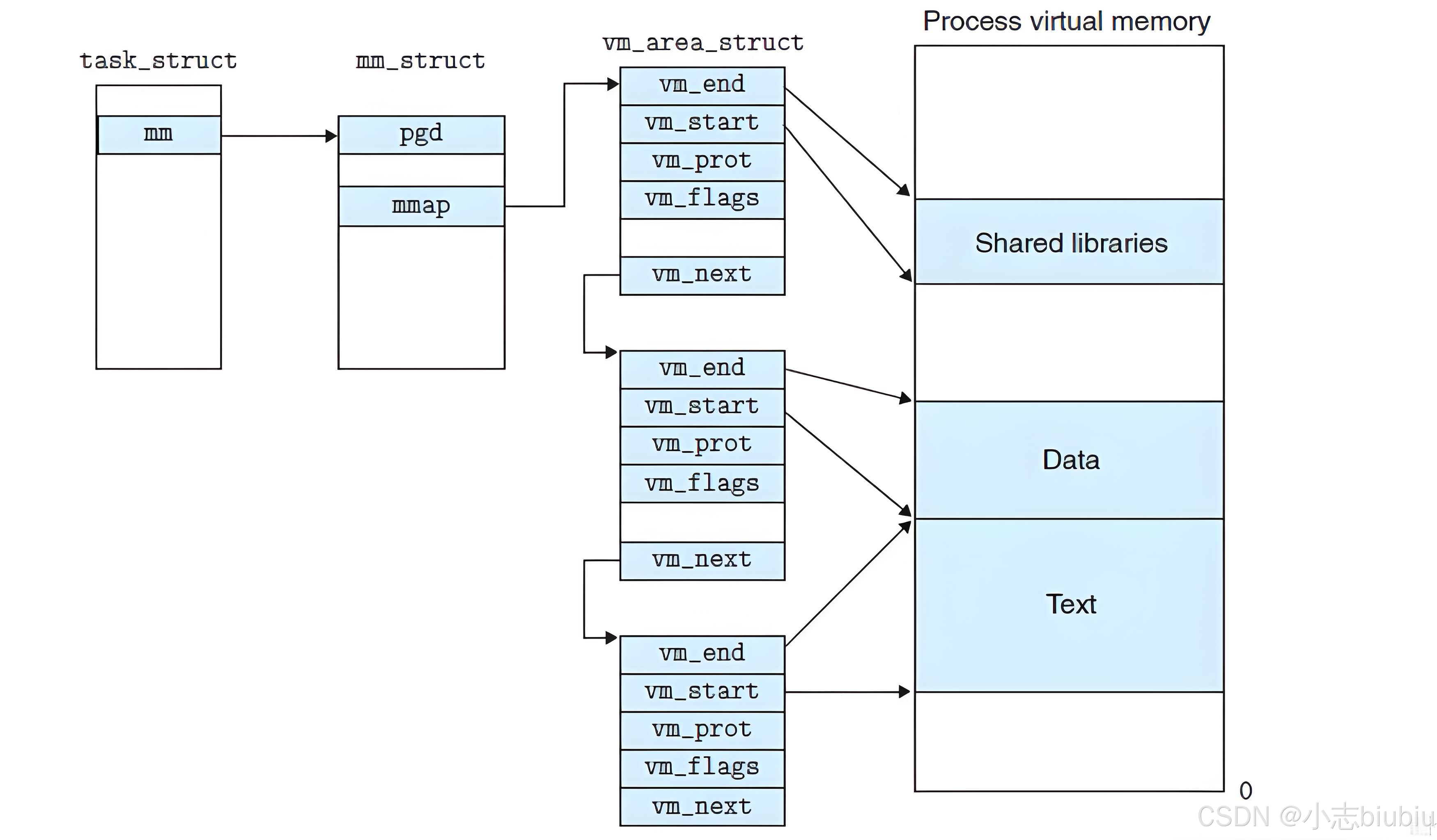 结构来表示一个独立的虚拟内存区域(VMA),由于每个不同质的虚拟内存区域功能和内部机制都不同,因此一个进程使用多个vm_area_struct结构来分别表示不同类型的虚拟内存区域。上面提到的两种组织方式使用的就是vm_area_struct结构来连接各个VMA,方便进程快速访问。