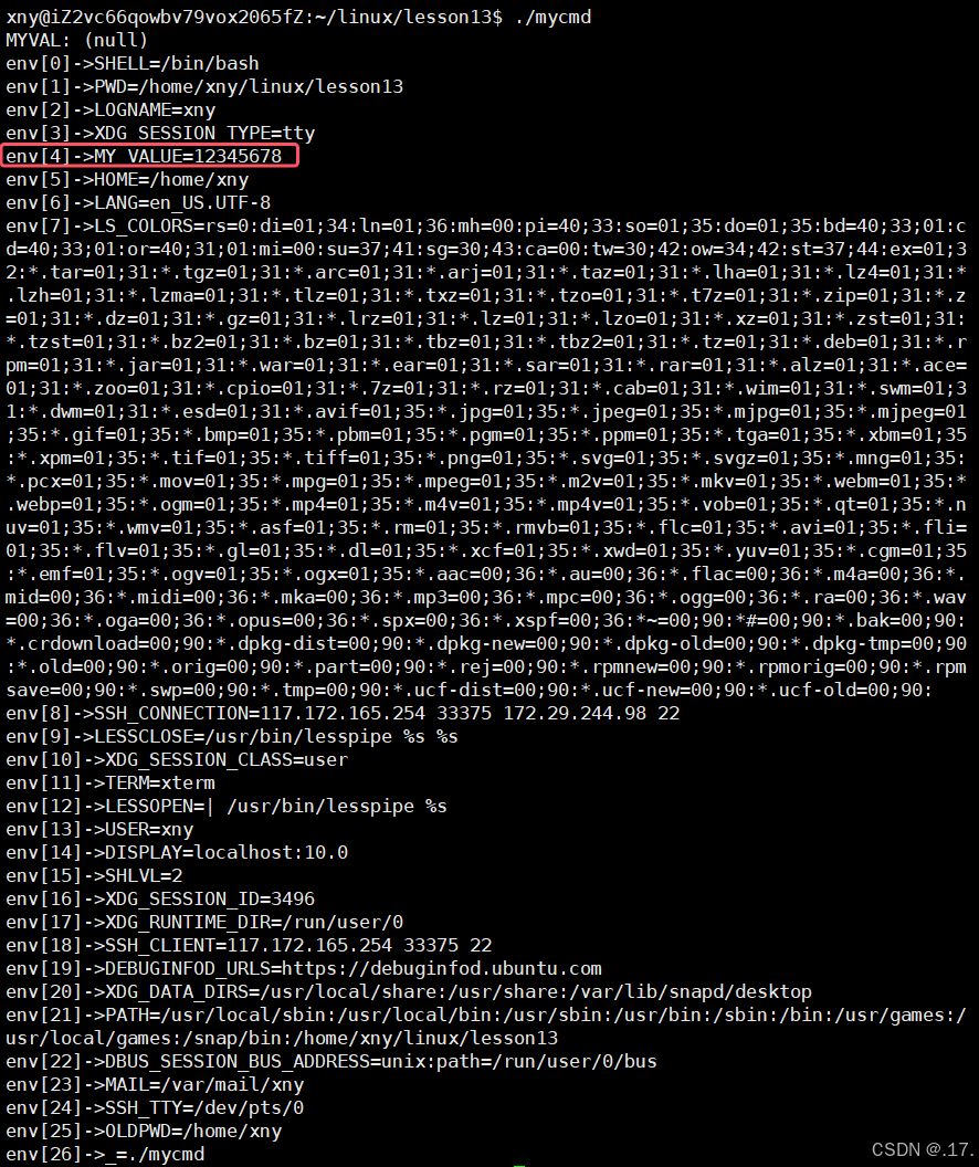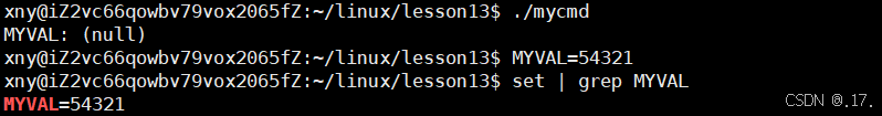 下面执行子进程 ./mycmd,可以发现它里面也有 MY_VALUE 这个环境变量,说明子进程 mycmd 继承了父进程 bash 的环境变量。