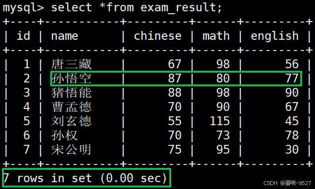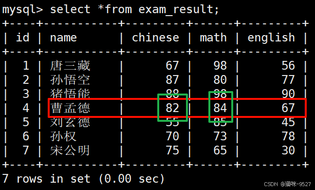 update exam_result set math=80 where name='孙悟空';更新前: | 更新后 |