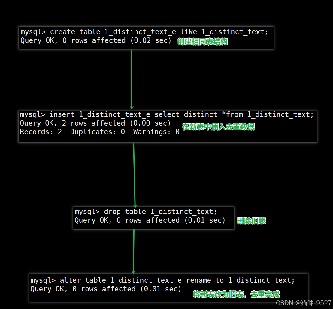 create table <新表名> like <原表名>; | create table <新表名> as select distinct *from <旧表名>; |