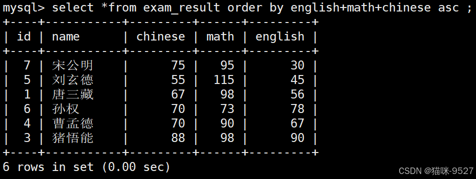 delete from exam_result order by english+math+chinese asc limit 1;删除前: | 删除后: |