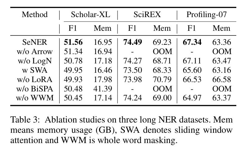 表3:三个长文本命名实体识别数据集的消融研究。Mem代表内存使用量(GB),SWA表示滑动窗口注意力,WwM是全词 Mask 。