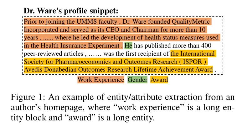 图1:从作者个人主页中提取实体/属性的一个示例,其中“工作经验”是一个较长的实体块,“奖项”是一个较长的实体。
