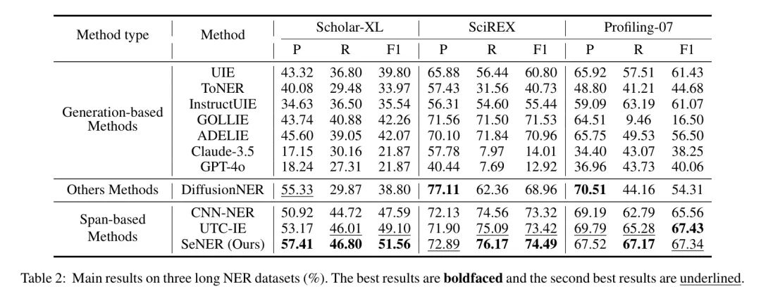 作者对三个命名实体识别(NER)数据集进行了实验:ScholarXL(张等,2024年)、SciREX(贾因等,2020年)和Profiling-07(唐、张、姚,2007年;唐等,2008年)。所有数据集的统计数据详见表1。如表1所示,这三个数据集的输入长度和实体长度均长于传统命名实体识别数据集,这带来了更大的挑战。