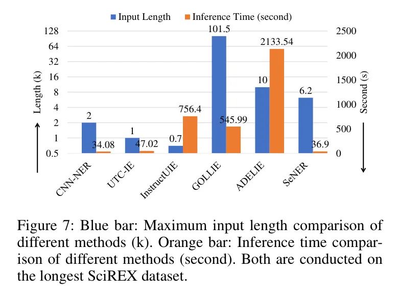 图7展示了基于跨度方法和基于LLM方法的推理时间。可以观察到,基于LLM的方法的推理时间比基于跨度方法长10倍。作者的方法SeNER在推理时间上与CNN-NER相当,同时实现了显著更高的提取精度。与UTCIE相比,SeNER可节省20%的推理时间,并能够编码更长的输入文本,同时仍保持最先进的提取精度。