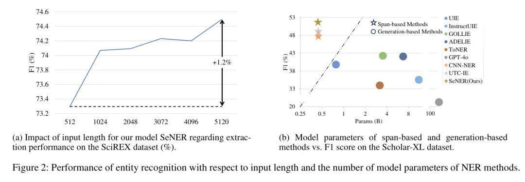 SeNER在保持相对较小的模型参数的同时,实现了最先进的准确率,如图2b所示。此外,在相同的硬件和配置下,作者的模型能够处理比之前的高级基于跨度命名实体识别(NER)方法长6倍的文本。