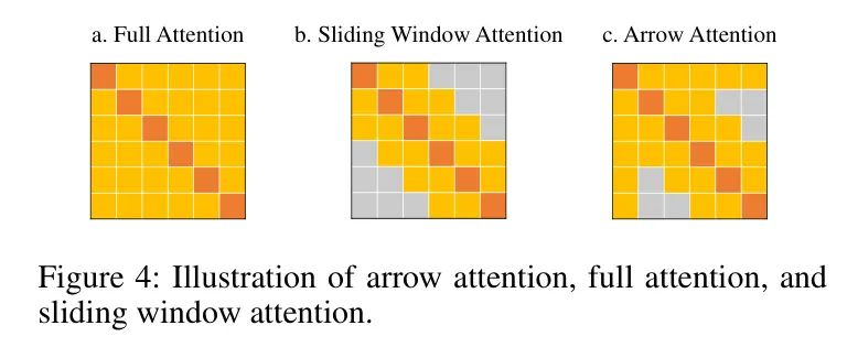 图4:箭头注意力、全注意力以及滑动窗口注意力的示意图。