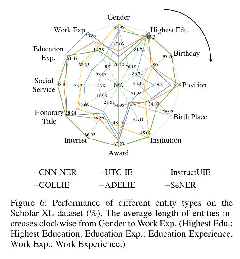 图6展示了在Scholar-XL数据集上的结果,实体类型的平均长度从“性别”顺时针增加到“工作经验”。利用LLM强大的能力,生成式方法在提取“性别”和“出生地”类型时取得了优异的性能。然而,对于其他类型的实体,基于跨度的方法表现出持续的优势。作者的模型SeNER在大多数实体类型上优于CNN-NER和UTC-IE,尤其是在较长的实体类型上取得了显著提升。具体来说,对于“社会服务”这一类型,作者的方法相较于CNN-NER提高了6.38%,相较于UTC-IE提高了4.14%。SeNER在“教育经历”和“工作经验”类型上的性能略逊于领先者,这表明作者模型中的近似策略不可避免地会丢失一些信息,尤其是在非常长的实体上。