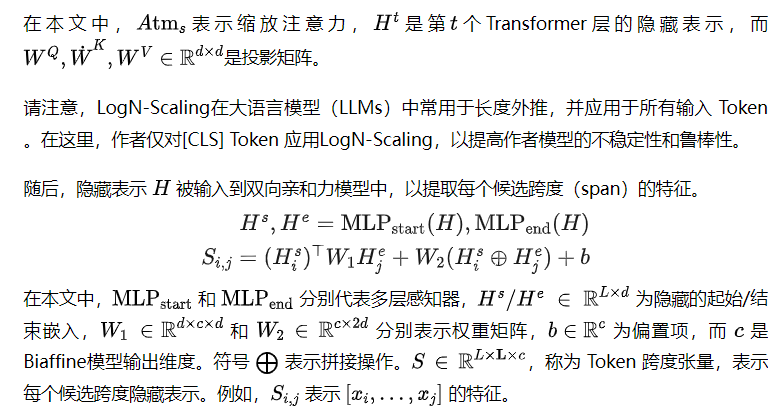 为了有效地对长文本进行编码,作者采用了双向箭头注意力机制,该机制同时编码局部和全局上下文。为了克服不同长度输入文本的熵不稳定问题,作者在[CLS] Token 上应用LogN-Scaling(苏,2021),以保持注意力分数的熵稳定。为了减少基于跨度的不必要计算以及 Token 对跨度之间的模型交互,作者提出了一种新型的双向滑动窗口加注意力(BiSPA)机制,以高效地计算关注跨度上的水平和垂直注意力。