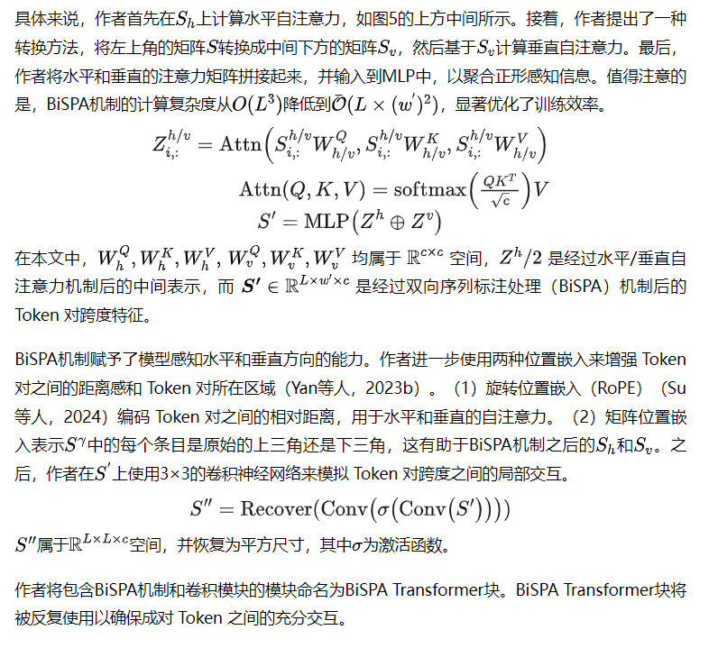 此外,作者还提出了一种双向滑动窗口加形状注意力(BiSPA)机制,该机制显著减少了冗余的候选 Token 对跨度,并建模了它们之间的交互。