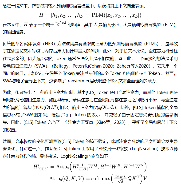 命名实体识别(NER)是自然语言处理(NLP)中的一个基本问题。然而,从扩展文本(如主页)中提取较长的实体跨度(例如奖项)的任务却很少被研究。 当前的NER方法主要分为两类:基于跨度的方法和基于生成的方法。基于跨度的方法需要列举所有可能的 Token 对跨度,然后对每个跨度进行分类,导致大量的冗余计算和过度的GPU内存使用。相比之下,基于生成的方法涉及 Prompt 或微调大语言模型(LLMs)以适应下游NER任务。 然而,这些方法在准确生成较长的跨度方面存在困难,并且通常需要大量的时间成本才能进行有效的微调。 为了解决这些挑战,本文提出了一种轻量级的基于跨度的NER方法,称为SeNER,该方法结合了双向箭头注意力机制和[CLS] Token 上的LogNScaling,以有效地嵌入长文本,并包含了一种新颖的双向滑动窗口加形注意力(BiSPA)机制,显著减少了冗余的候选 Token 对跨度,并同时模拟 Token 对跨度之间的相互作用。 广泛的实验表明,作者的方法在三个长NER数据集上实现了最先进的提取准确率,并且能够以GPU内存友好的方式从长文本中提取实体。