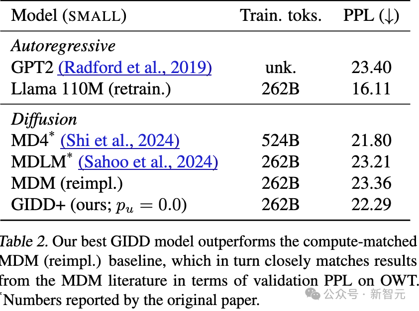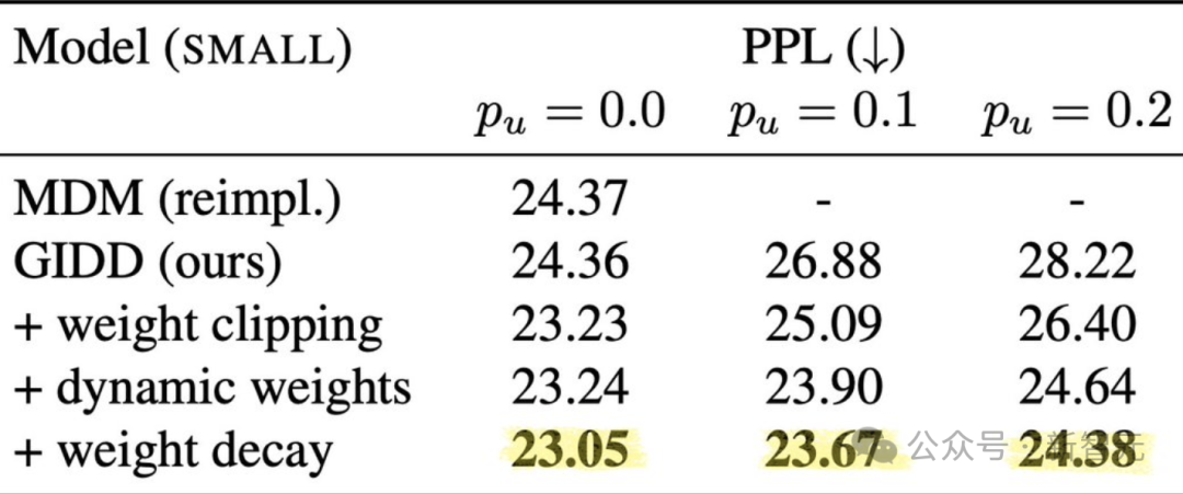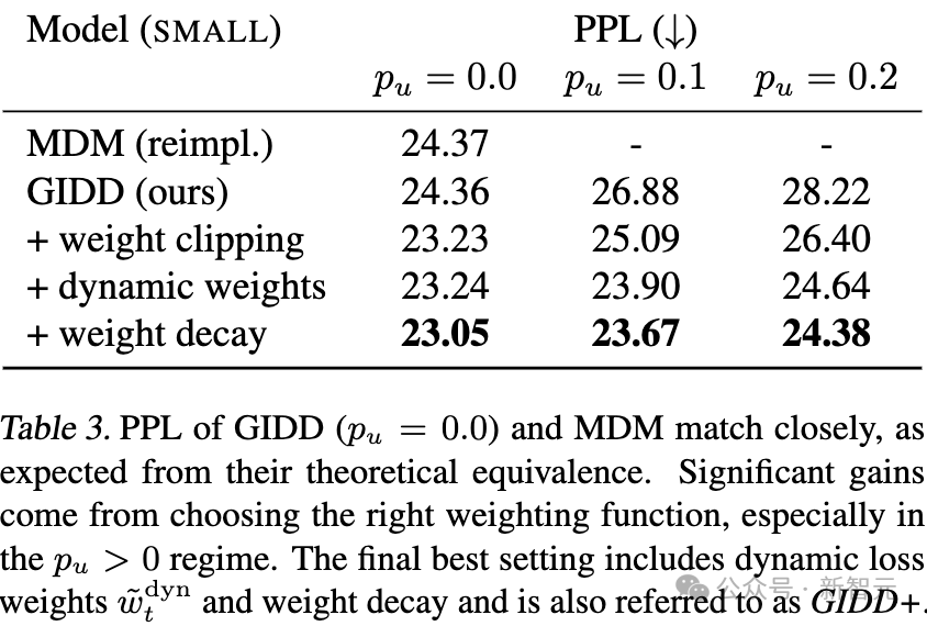 表3:GIDD(p_u = 0.0)和MDM的困惑度(PPL)非常接近,这与它们的理论等价性一致。