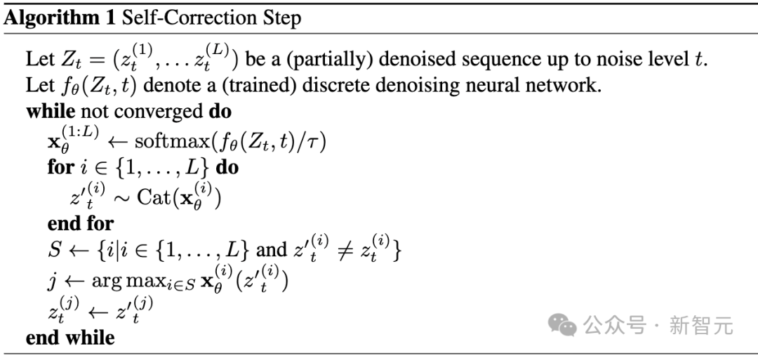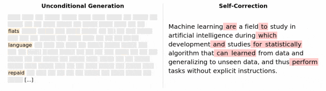为了弄清楚这一点,提出了一种自我纠正算法,通过一次修复一个token(使用模型)来改进已经生成的样本,直到收敛到一个稳定点。