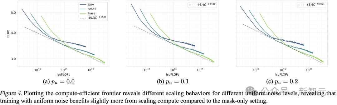 无论均匀噪声水平如何,模型的性能都随着规模的增加而持续提升。然而,使用均匀噪声训练的模型,在性能上略微但持续落后于仅使用掩码噪声的模型。