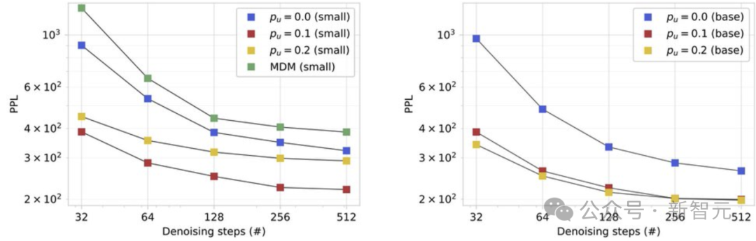 从实验来看,虽然增加去噪步骤确实会单调提升样本质量,但这种提升最终会趋于饱和(对于BASE模型,PPL约停留在200)。