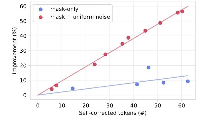 目前为止,观察到仅使用掩码训练的模型往往优于结合均匀噪声的模型,但尚未讨论引入均匀噪声的核心动机:让模型学会区分「正确」与「错误」token,希望它能够具备自我纠正能力。