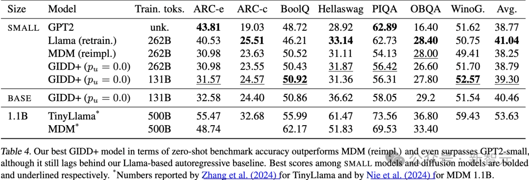 在扩散模型中,表现最好的是仅训练了131B token的GIDD+(p_u=0.0),超过了训练时间两倍的模型。