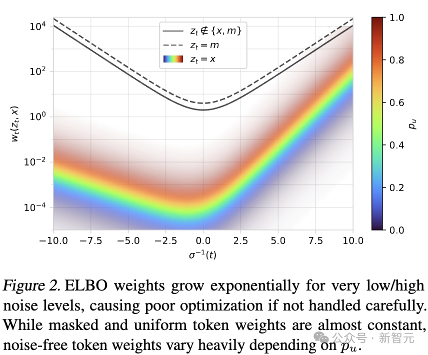 仔细分析扩散证据下界(ELBO)的权重wt(zt,x)后,发现当t→0或t→1时,权重的变化非常极端。