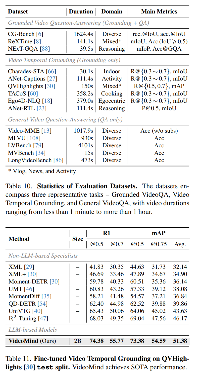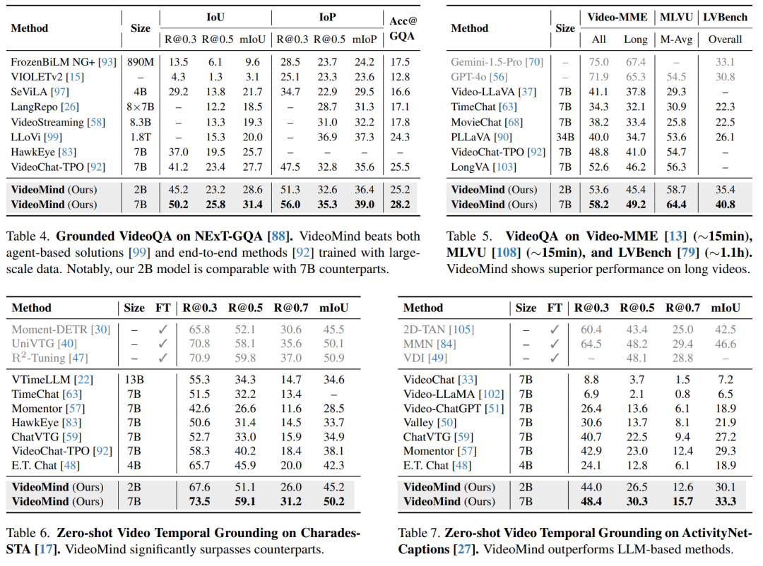 - LongVideoBench [86]:VideoMind 2B 模型在所有时长组上均取得了较好的性能,7B 模型进一步提升了性能。