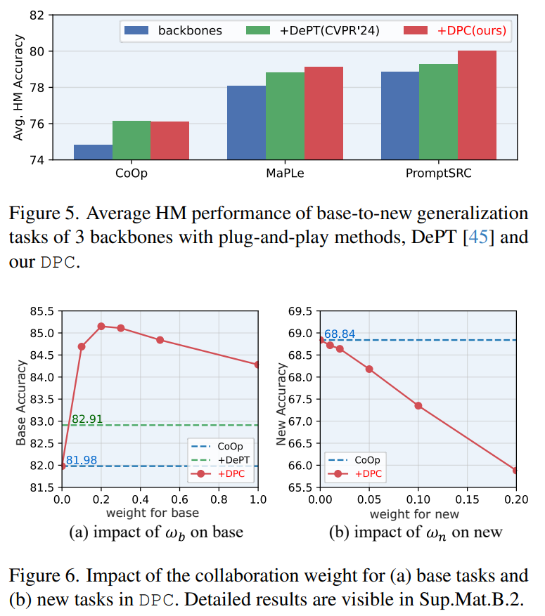 - 实验设置:将DPC与DePT(另一种插即用提示词学习器,它在特征级别上解耦基类和新类任务)进行比较。