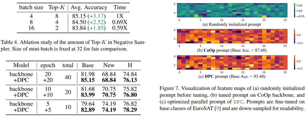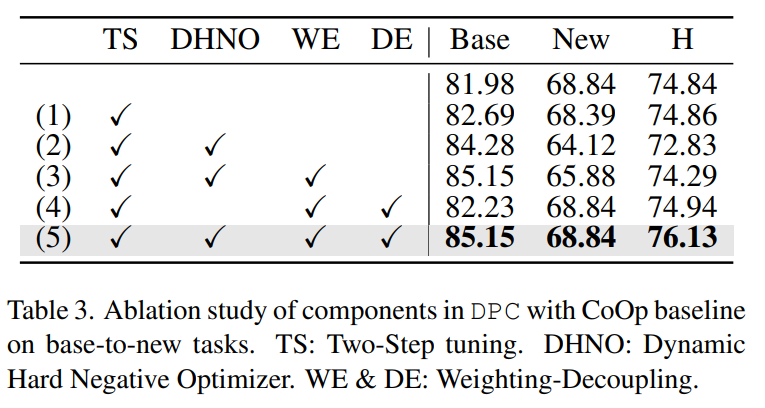 - 实验设置:基于CoOp基线,对DPC的各个子模块(如动态硬负样本优化器、权重解耦模块等)进行消融实验,以及对协作权重(ωb, ωn)、Top-K采样数量和微调周期等参数进行研究。