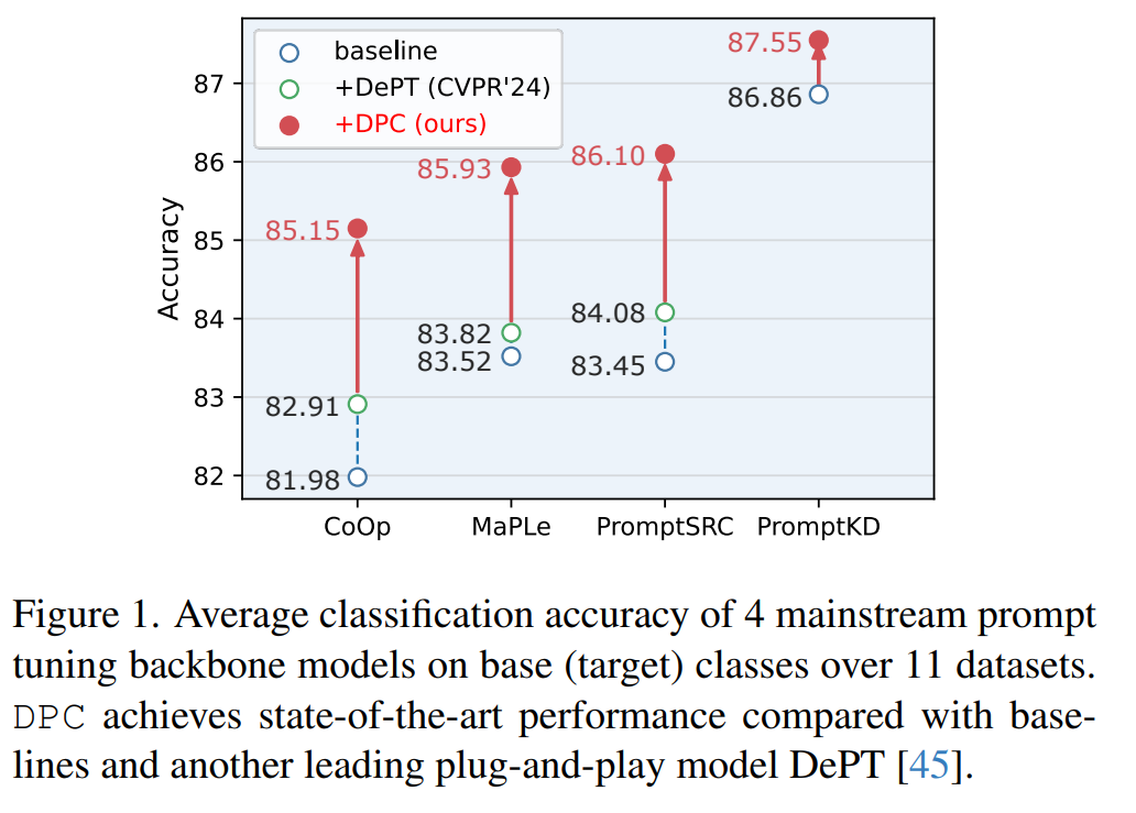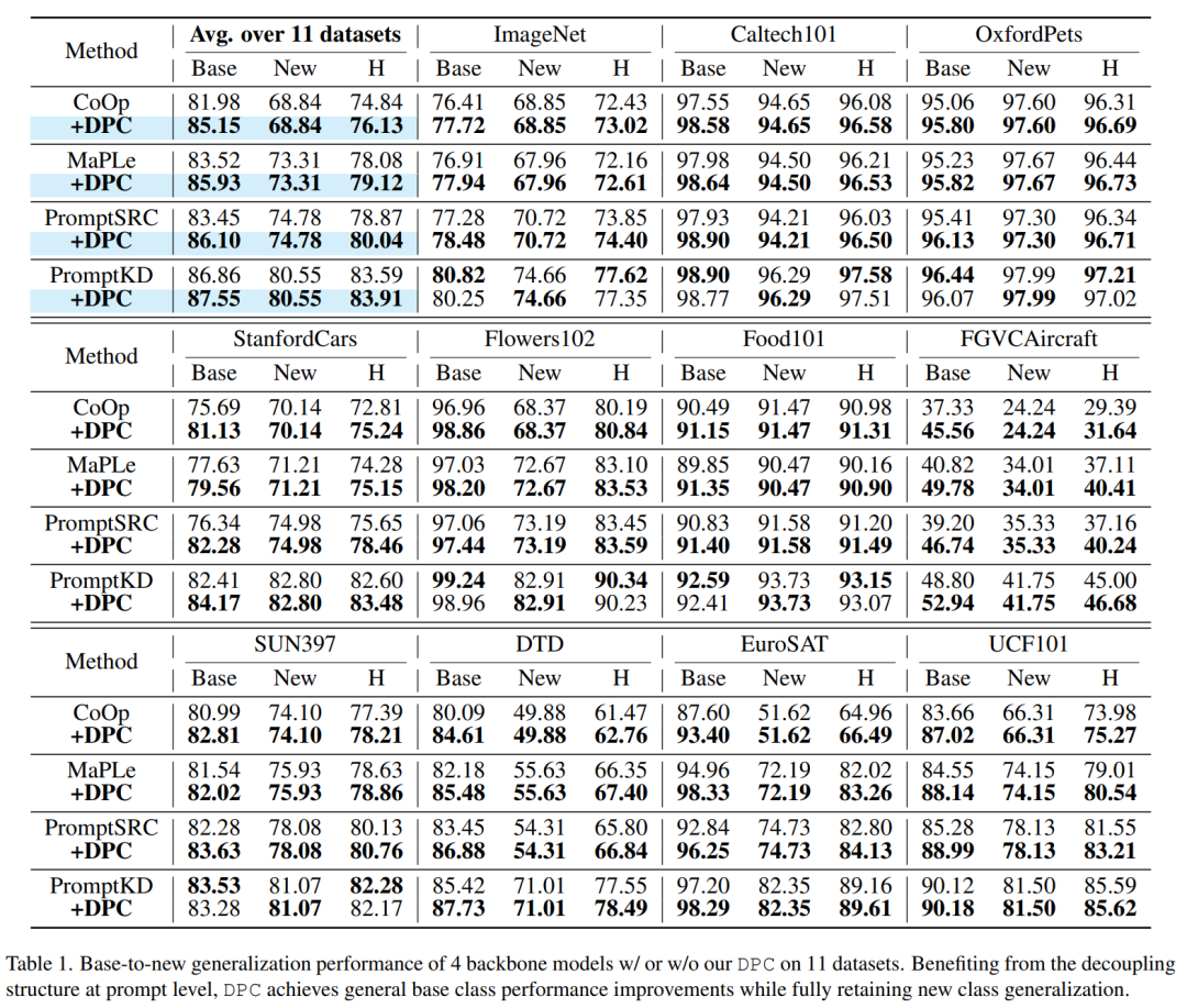DPC通过在提示词级别上解耦基类和新类的优化过程,有效解决了BNT问题。实验结果表明,DPC在多个基线模型和数据集上均取得了显著的性能提升,同时保持了对新类的泛化能力。此外,DPC具有出色的插即用特性和自包含性,无需引入外部知识,具有广泛的应用前景。
