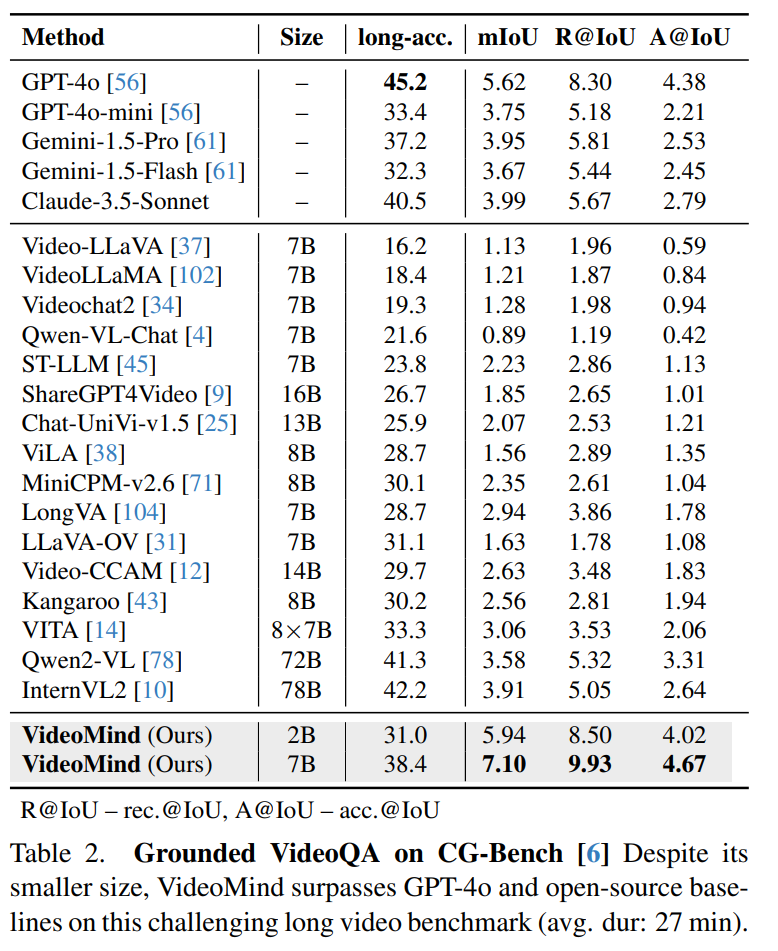 - MLVU [108]:VideoMind 2B 模型取得了 45.4% 的 Acc。VideoMind 7B 模型进一步提升了性能,取得了 49.2% 的 Acc。