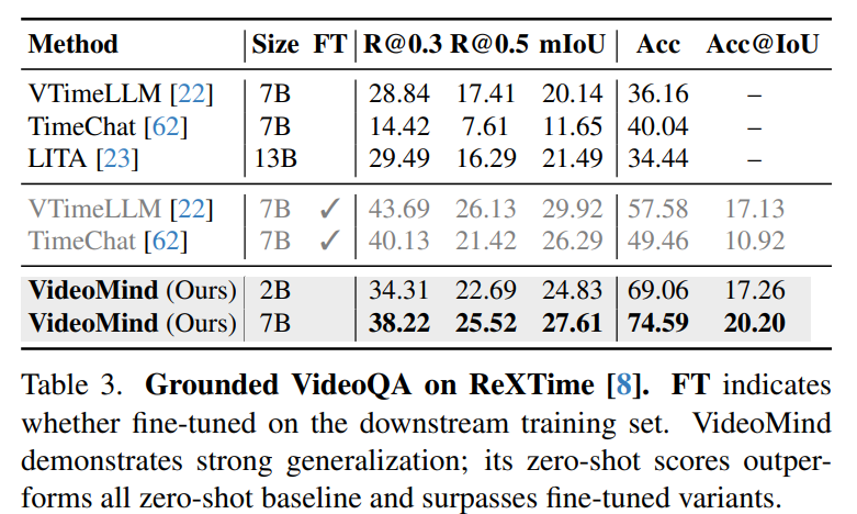 - QVHighlights [30]:VideoMind 2B 模型在 fine-tuned 设置下取得了 74.38% 的 R@0.5 和 55.77% 的 R@0.7。VideoMind 7B 模型进一步提升了性能,取得了 77.0% 的 R@0.5 和 78.0% 的 R@0.7。