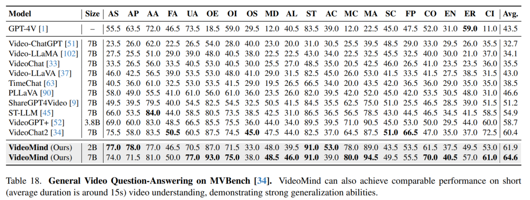 - MVBench [34]:VideoMind 2B 模型取得了 53.0% 的 Acc。VideoMind 7B 模型进一步提升了性能,取得了 60.4% 的 Acc。