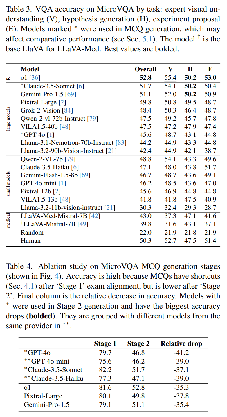 - 实验结果:两种消融实验都降低了模型的准确率,但准确率仍然高于随机猜测。这表明尽管 MicroVQA 是一个视觉中心的基准测试,但模型仍然可以利用语言捷径来回答一些问题。然而,通过专家分析发现,许多问题仍然需要图像理解才能正确回答。