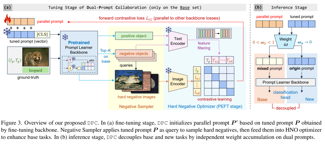 - 解决方案:DPC框架首先在预训练的提示词学习器的基础上,通过适度微调获得一个调优后的提示词(tuned prompt)。然后,基于这个调优后的提示词,初始化一个并行提示词(parallel prompt),其形式、大小和参数都从基线模型中克隆而来。这样,两个提示词可以分别用于新类的泛化和基类的增强,从而在提示词级别上解耦了基类和新类的任务。