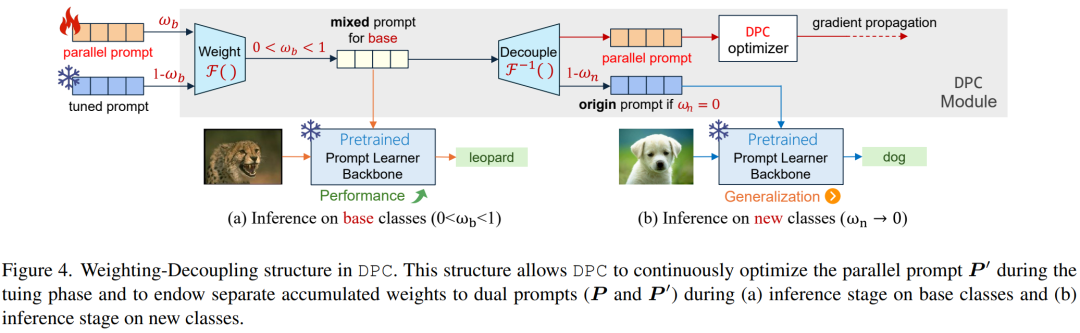 - 解决方案:DPC引入了一个灵活的权重调整框架,称为权重解耦模块(Weighting-Decoupling Module, WDM)。该模块在微调和推理阶段统一作用于双提示词的输入。在微调阶段,权重子模块(Weighting)将调优后的提示词和并行提示词组合成一个混合提示词(mixed prompt),并通过基类特定的权重系数(ωb)控制其权重分布。在推理阶段,解耦子模块(Decoupling)将混合提示词分解回并行提示词和调优后的提示词,并通过新类特定的权重系数(ωn)重新分配权重。