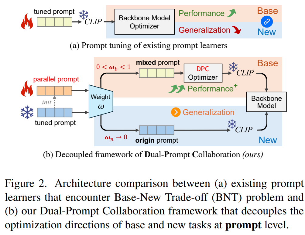 本文提出了Dual-Prompt Collaboration(DPC)框架,旨在解决视觉-语言模型(VLMs)中基于CLIP的提示词微调(Prompt Tuning)过程中存在的基类-新类权衡(Base-New Trade-off, BNT)问题。BNT问题指的是在基类上持续微调会导致模型对新类的泛化能力下降。DPC通过在提示词级别上解耦基类和新类的优化过程,有效地克服了这一问题。