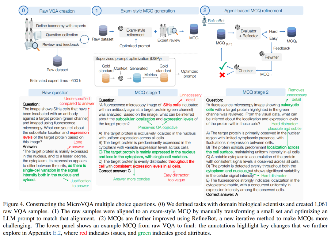 - 构建MicroVQA数据集:12位生物医学专家每人创建了约90个VQA样本,每个样本包括图像集、问题、详细回答和实验上下文信息。专家对样本进行了质量控制,确保问题具有挑战性,并且与定义的任务一致。