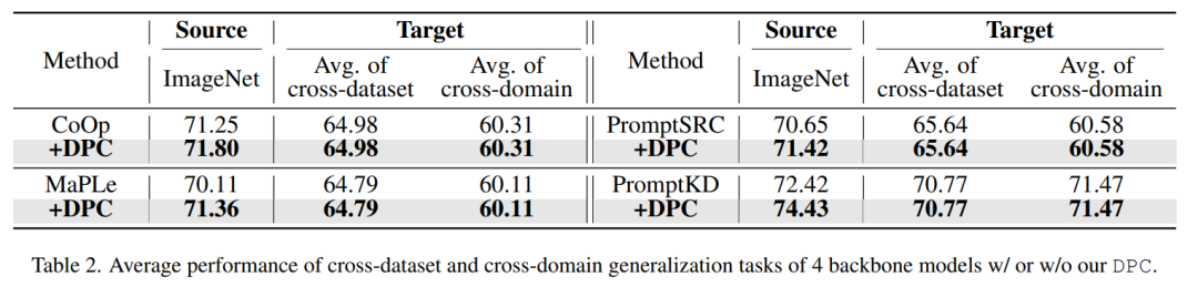 - 结果:DPC在所有基线模型上均取得了优于基线的性能,同时在涉及未见数据分布的跨数据集和跨域任务中保持了一致的泛化水平。